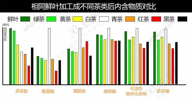 从表中可以看出白茶的黄酮类,氨基酸,可溶性碳水化合物,多糖等含量超过其他茶类。这是因为白茶加工(主要是萎凋过程)中适度地激发、利用了内源酶活性,有利于氨基酸、黄酮类、可溶性碳水化合物的形成和积累。也是白茶比其他茶类更具有保健功效的基础。