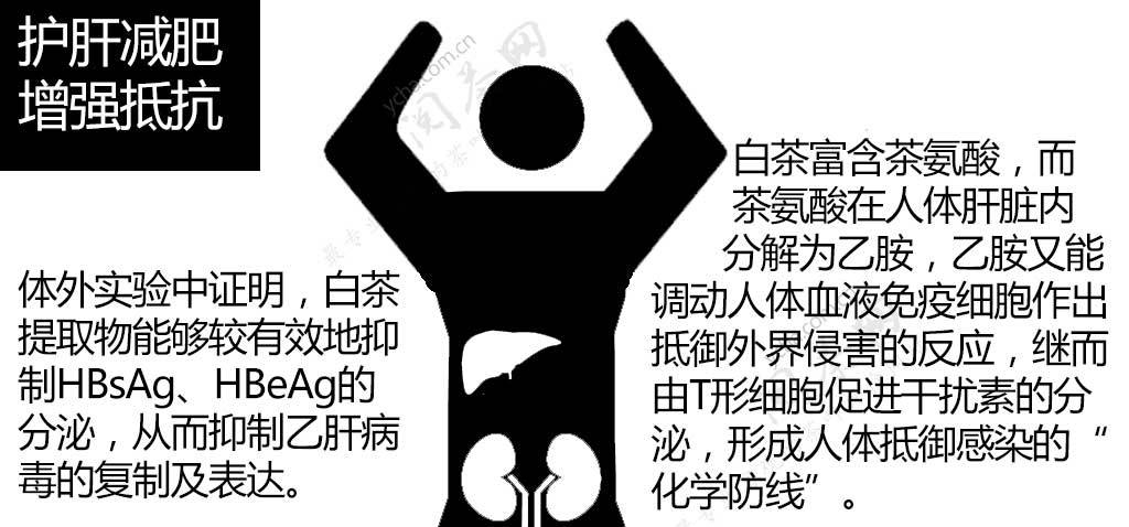 增强免疫力:白茶富含茶氨酸,而茶氨酸在人体肝脏内分解为乙胺,乙胺又能调动人体血液免疫细胞作出抵御外界侵害的反应,继而由T形细胞促进干扰素的分泌,形成人体抵御感染的“化学防线”。