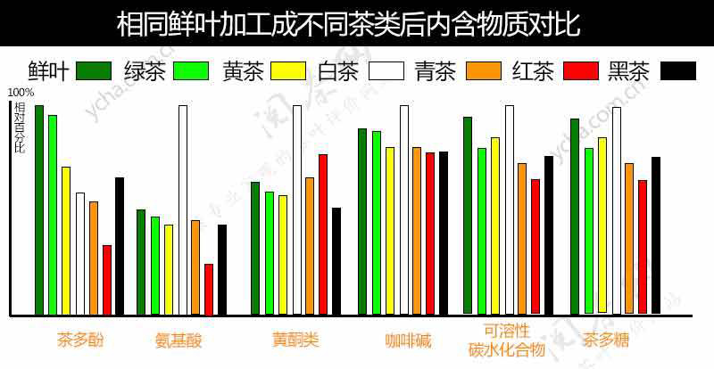 从表中可以看出白茶的黄酮类,氨基酸,可溶性碳水化合物,多糖等含量超过其他茶类。这是因为白茶加工(主要是萎凋过程)中适度地激发、利用了内源酶活性,有利于氨基酸、黄酮类、可溶性碳水化合物的形成和积累。也是白茶比其他茶类更具有保健功效的基础。