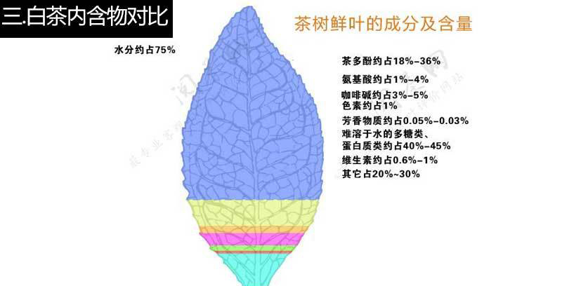 白茶功效这么牛,你知道为什么吗?虽然不同茶叶里面茶多酚、氨基酸、生物碱、糖类、芳香类物质、维生素类、矿物质、蛋白质等等内含物组分几乎一样,但是白茶在有效成分含量上可是鹤立鸡群。