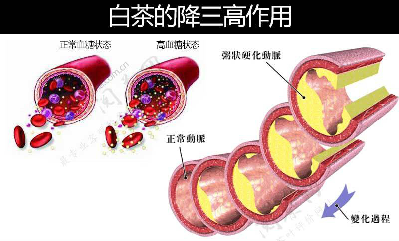 降血糖血脂:白茶特殊的加工工艺较好地保留了人体所必需而其它茶类含量较少的活性酶,长期饮用白茶可以显著提高人体内脂蛋白脂肪酶活性,促进脂肪分解代谢,有效控制胰岛素分泌量,延缓葡萄糖的吸收,分解体内多余的糖分,促进血糖平衡。同时促进胰液分泌,使血糖来路减少,去路增加。