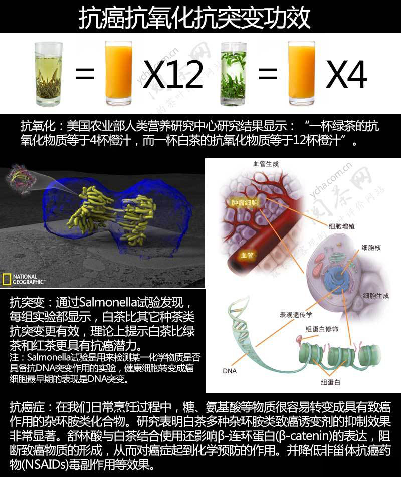 抗突变:通过Salmonella试验发现,每组实验都显示,白茶比其它种茶类抗突变更有效,理论上提示白茶比绿茶和红茶更具有抗癌潜力。